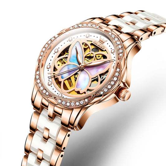 Butterfly Diamond-encrusted Hollowed Out Mechanical Skin With Steel Belt Women's Watch