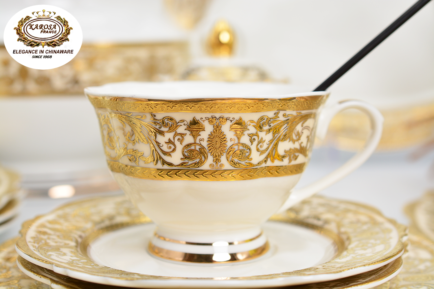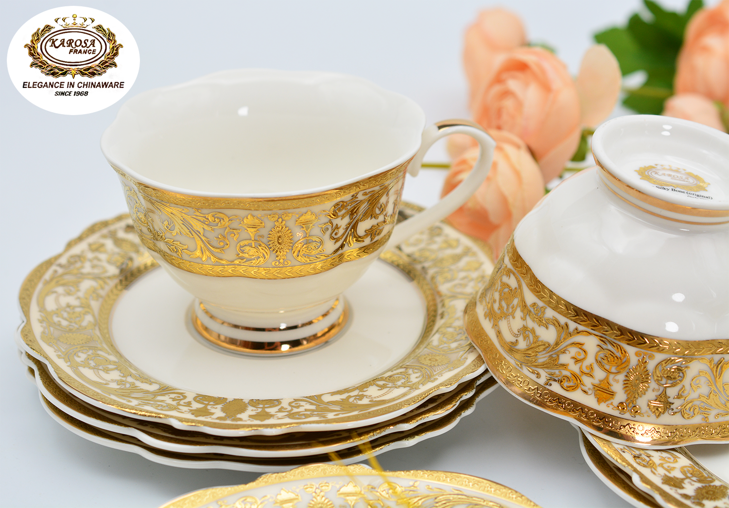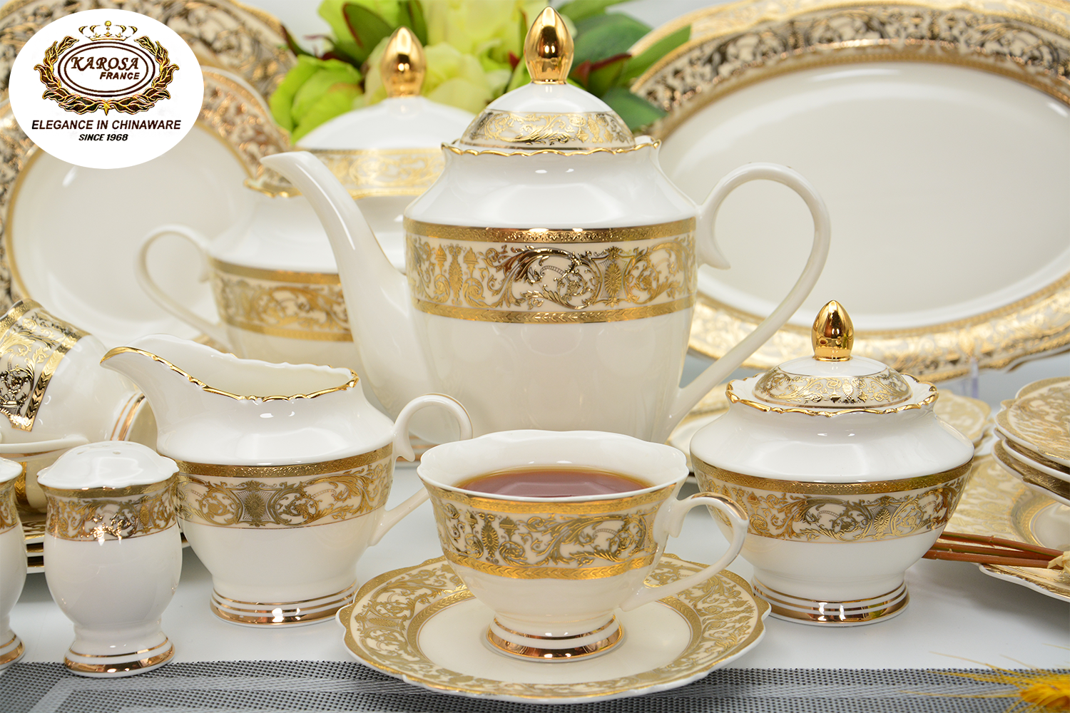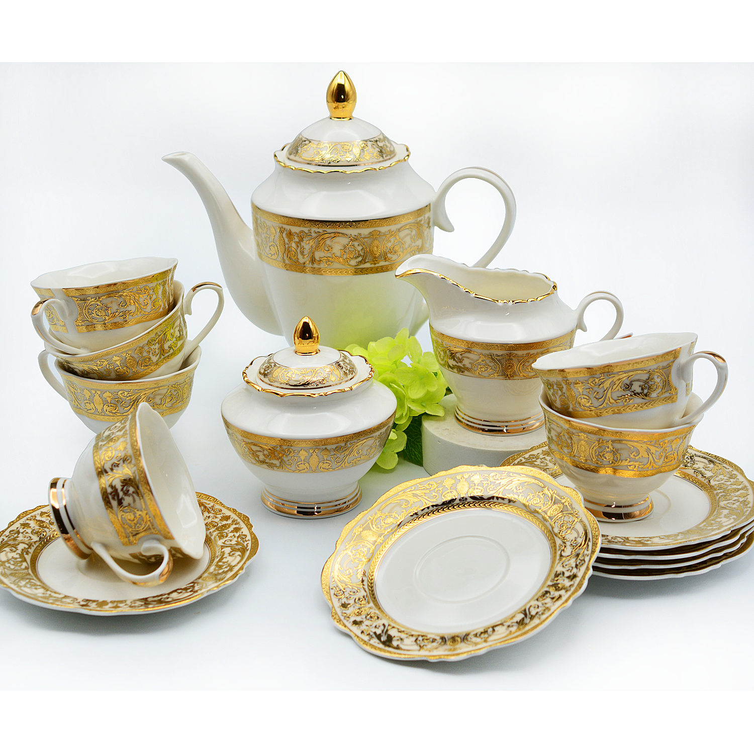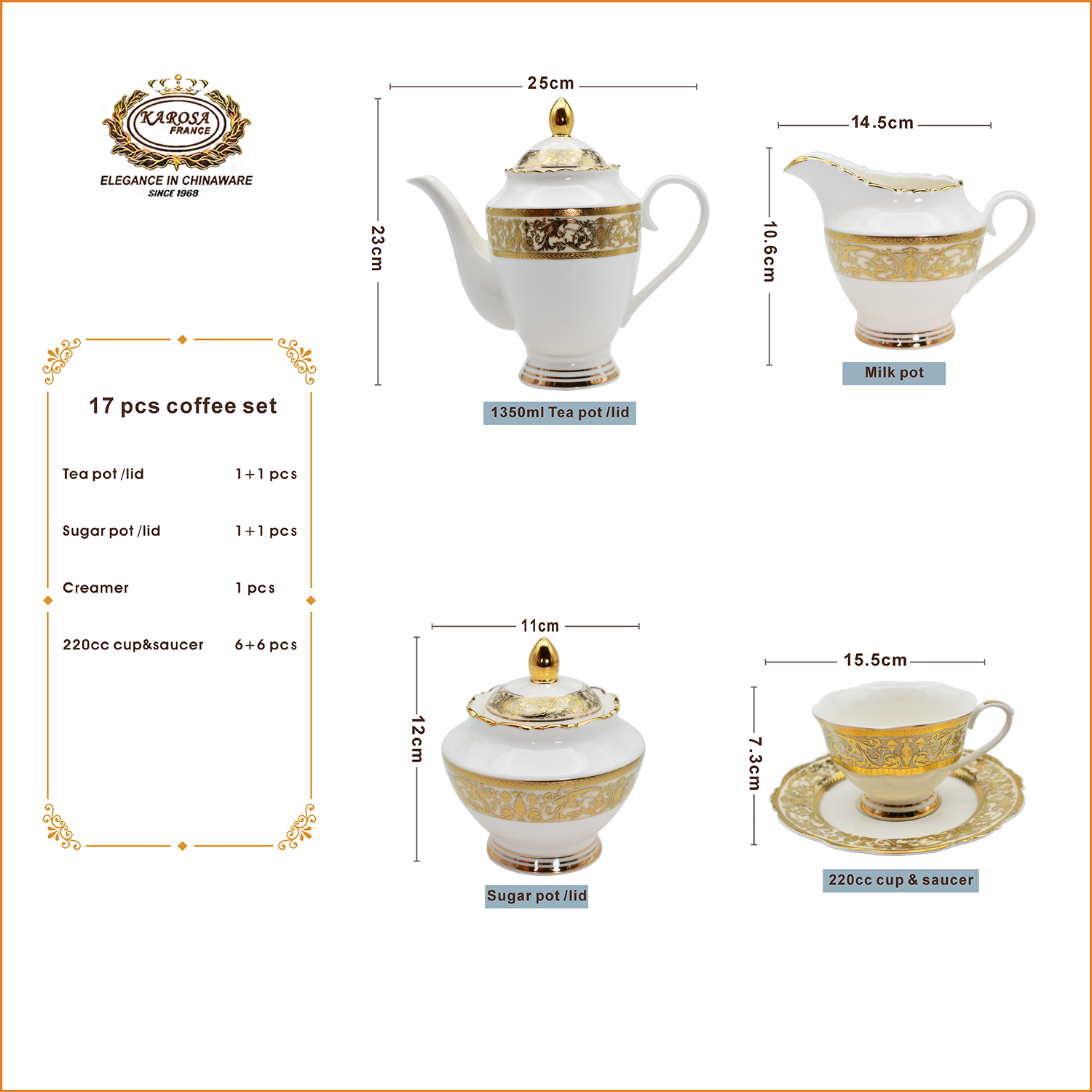 17 PCS Embossed Gold Porcelain Tea Set Luxury Style Bone China Tea Cup Set