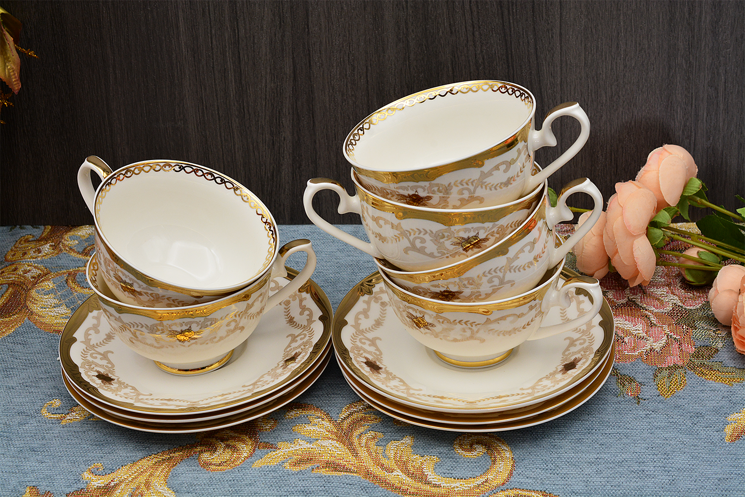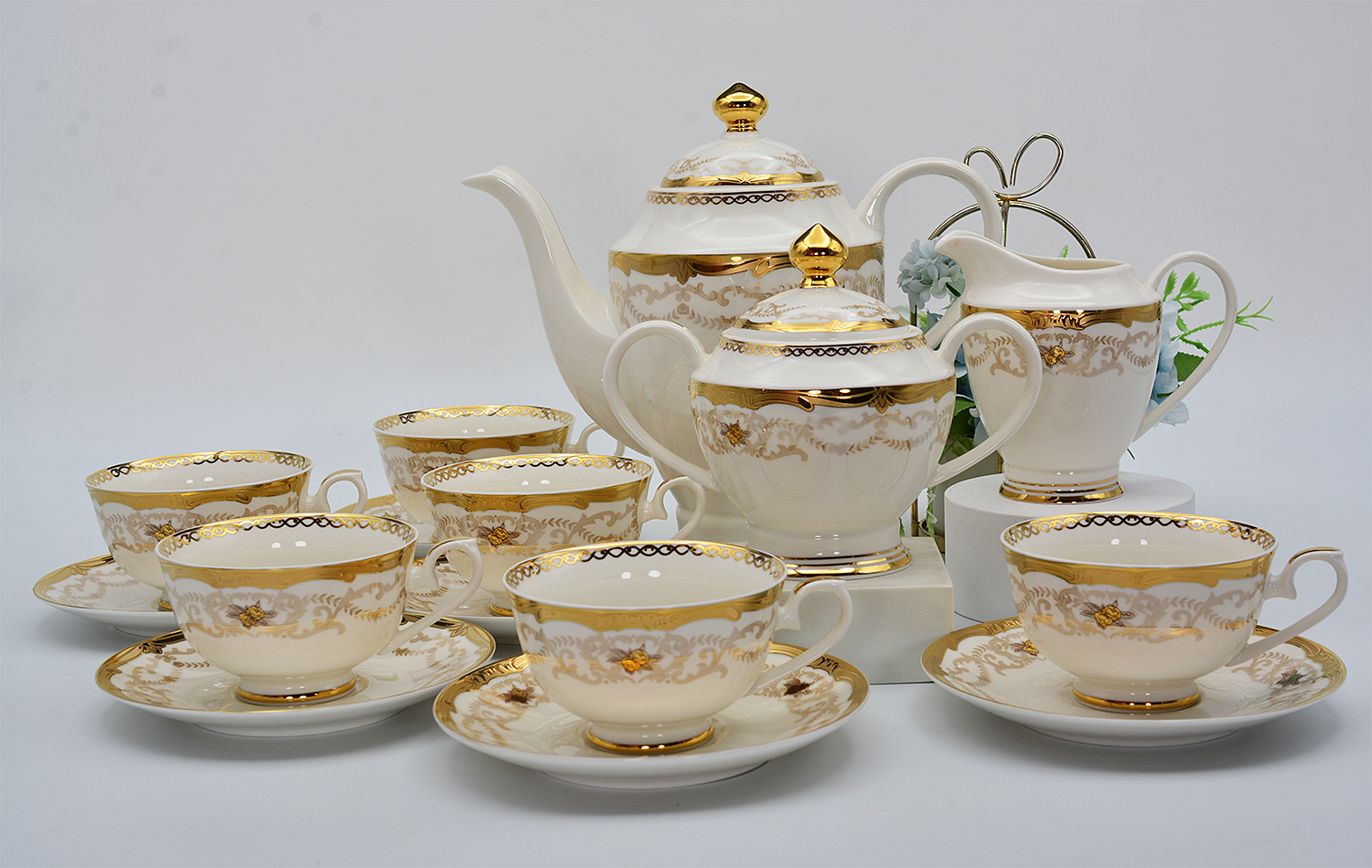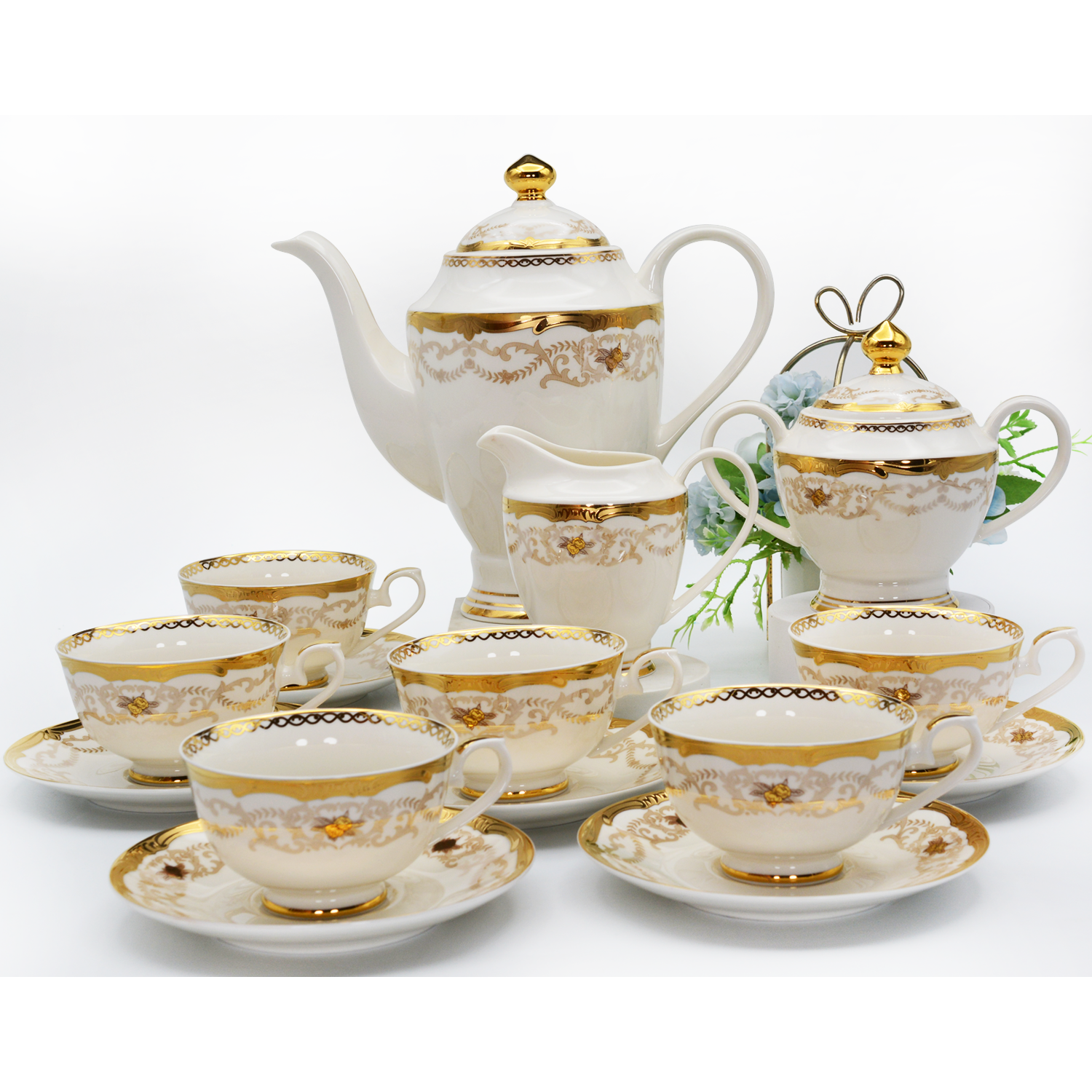 17 PCS Tea Sets With 6 Cups 6 Saucers Embossed Gold Royal Style Bone China Coffee Tea Sets