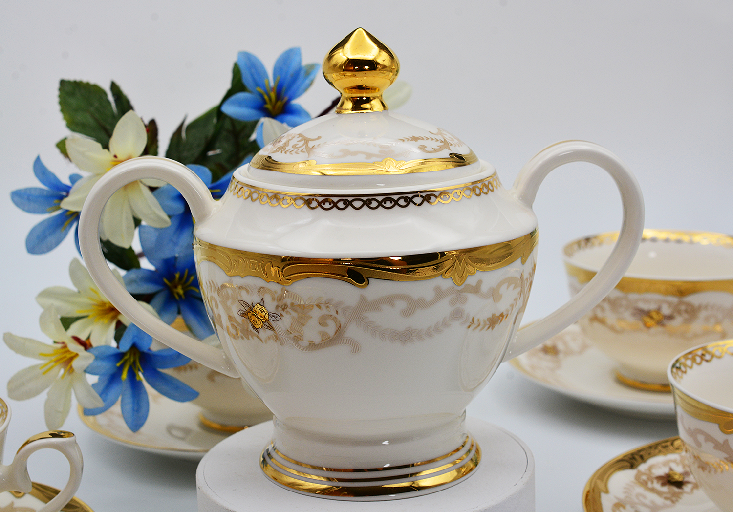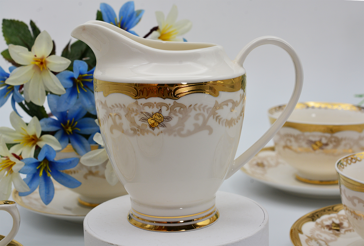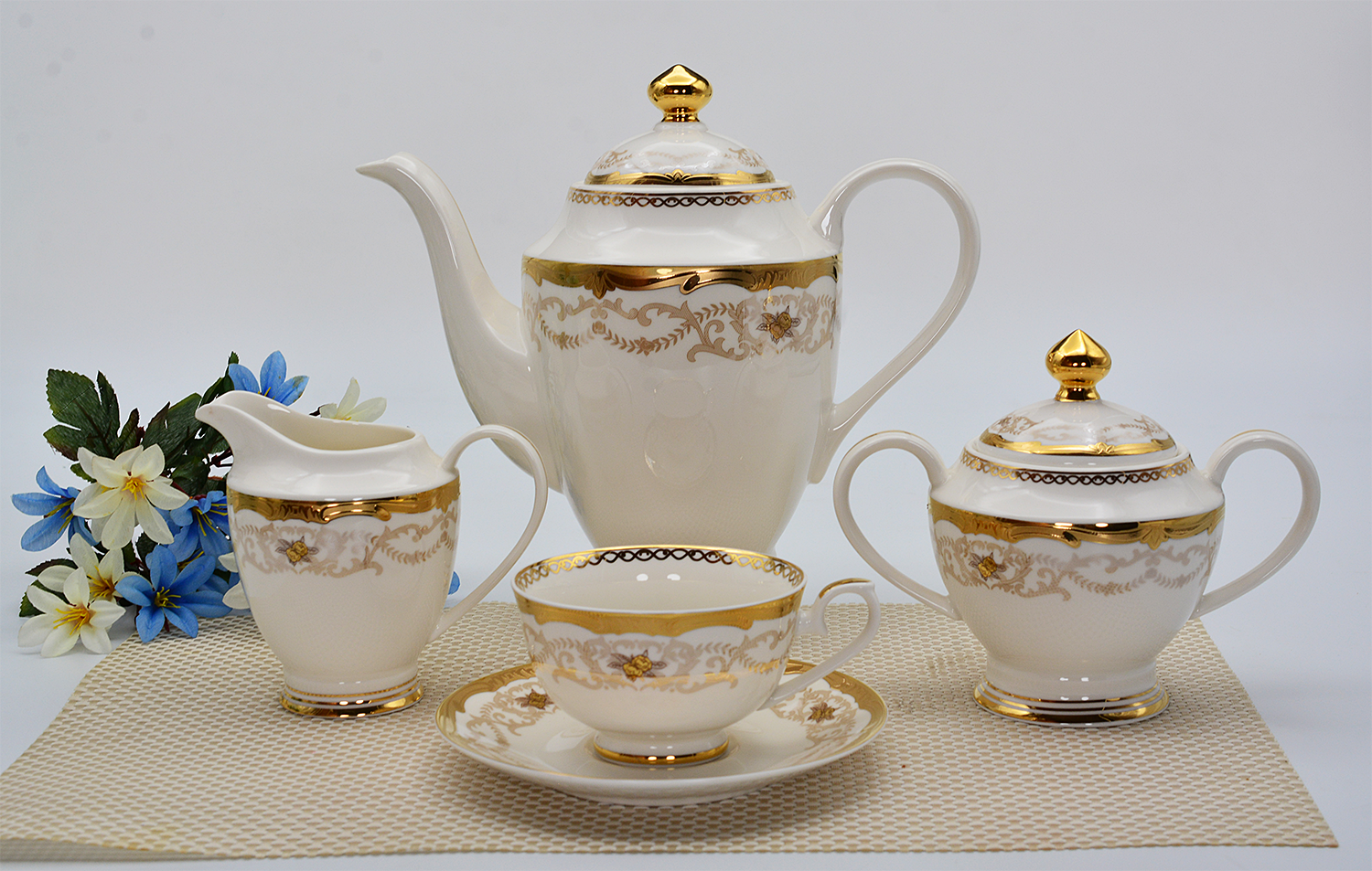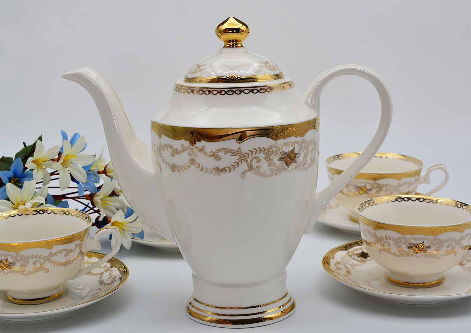17 PCS Tea Sets With 6 Cups 6 Saucers Embossed Gold Royal Style Bone China Coffee Tea Sets